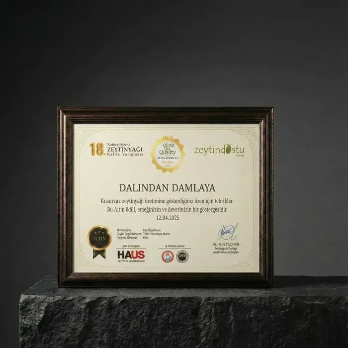We have reached the summit! Years of discipline, love for the land, and meticulous care have led us to this proud moment. We are thrilled to announce that "Dalından Damlaya" has been awarded the prestigious GOLD MEDAL at the 18th Natural Extra Virgin Olive Oil Quality Competition (2025) by the Zeytindostu Association.