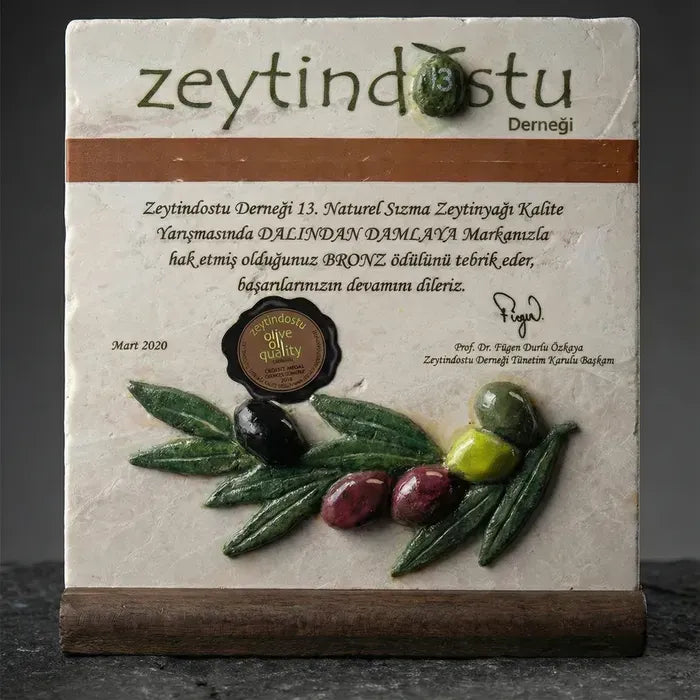 Every great journey begins with a first step. For "Dalından Damlaya," that step was recognized in March 2020. We were honored to receive the Bronze Medal at the 13th Natural Extra Virgin Olive Oil Quality Competition organized by the Zeytindostu Association. This award was our first major milestone, proving that our passion for nature and respect for the olive tree translates into genuine quality in the bottle. It was the moment we knew we were on the right path.