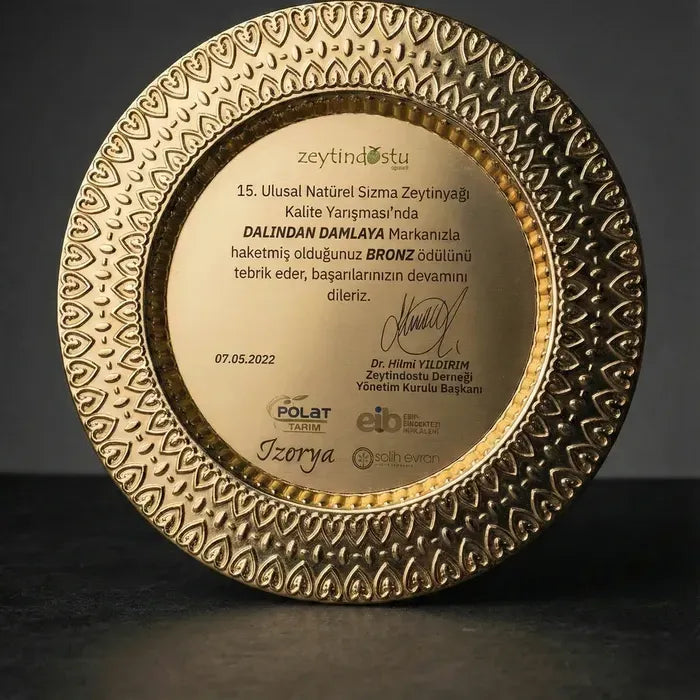 Success is not a destination; it is a continuous commitment. In 2022, at the 15th National Natural Extra Virgin Olive Oil Quality Competition, "Dalından Damlaya" was once again awarded the Bronze Medal. This recognition stands as a testament to our stability. It proves that our flavor is not a coincidence, but the result of unwavering standards and dedicated craftsmanship. From our groves to your table, we promise the same premium quality in every harvest.